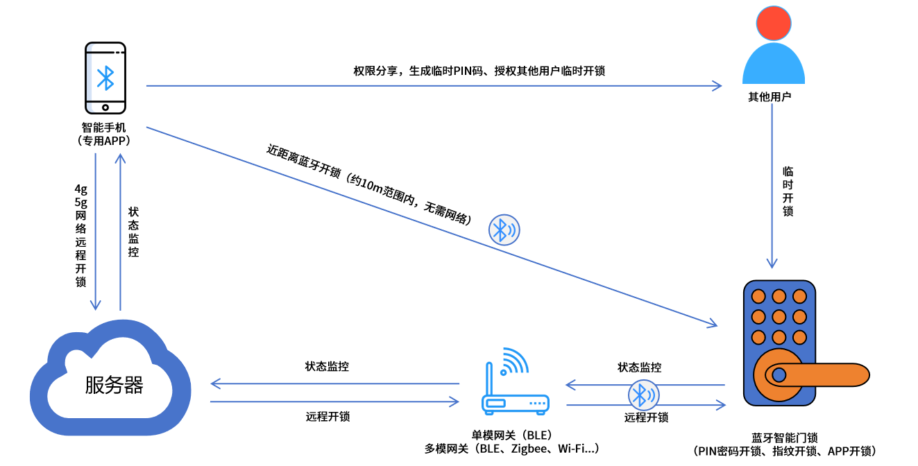 蓝牙智能门锁是一种通过BLE协议与用户智能手机或其他授权设备进行互联的电子门锁,用户可通过手机APP实现无钥匙蓝牙开锁、远程开锁、生成临时密码与实时查看门锁状态及操作记录等功能,且其还采用了加密协议确保通信安全。相较于传统机械门锁,蓝牙智能门锁可为用户带来更便捷、人性化的开门体验。